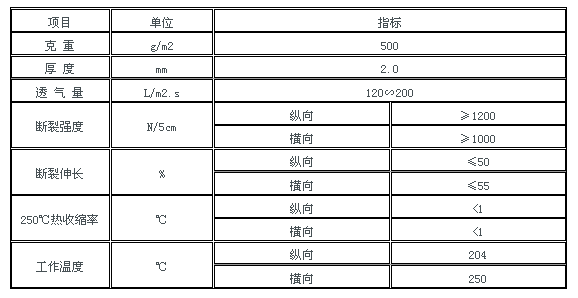美塔斯针刺毡可在204℃的温度下连续操作(瞬间温度250℃)并可承受反复的250℃瞬间的波动温度,同时具有杰出的尺寸稳定性能,在250℃的温度下只有小于是1%的热收缩率,具有高温稳定性。良好的耐化学性能在低浓度的酸碱和大多数碳氢化合物对它不会造成影响,即使少量的氟化物也不会明显地腐蚀它。美塔斯过滤材料已被证明可以广泛应用于高温过滤领域,长期使用可保持高强力、高耐磨性。广泛应用于沥青、水泥、钢铁、有色金属、石灰、粉尘、冶金、烘干、碎石、石膏、塑胶、炭黑、焦炭、造船、烟草等行业。